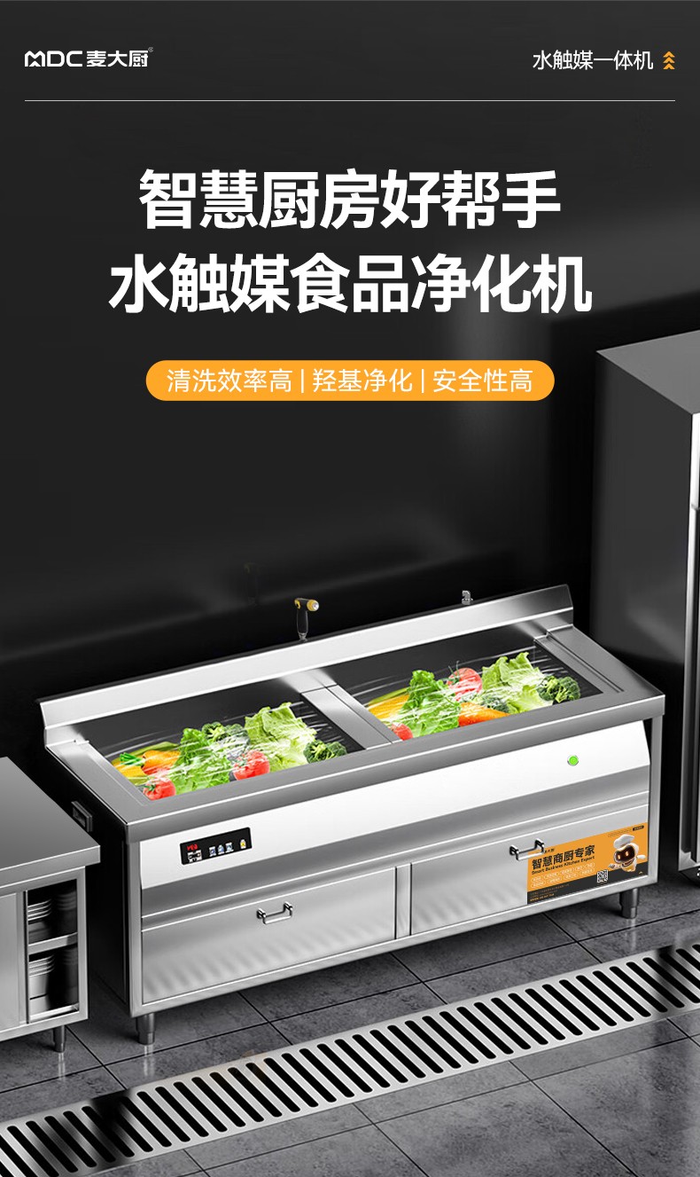 麥大廚1.8米自動商用洗菜機去農藥殘留雙缸水觸媒雙凈化機